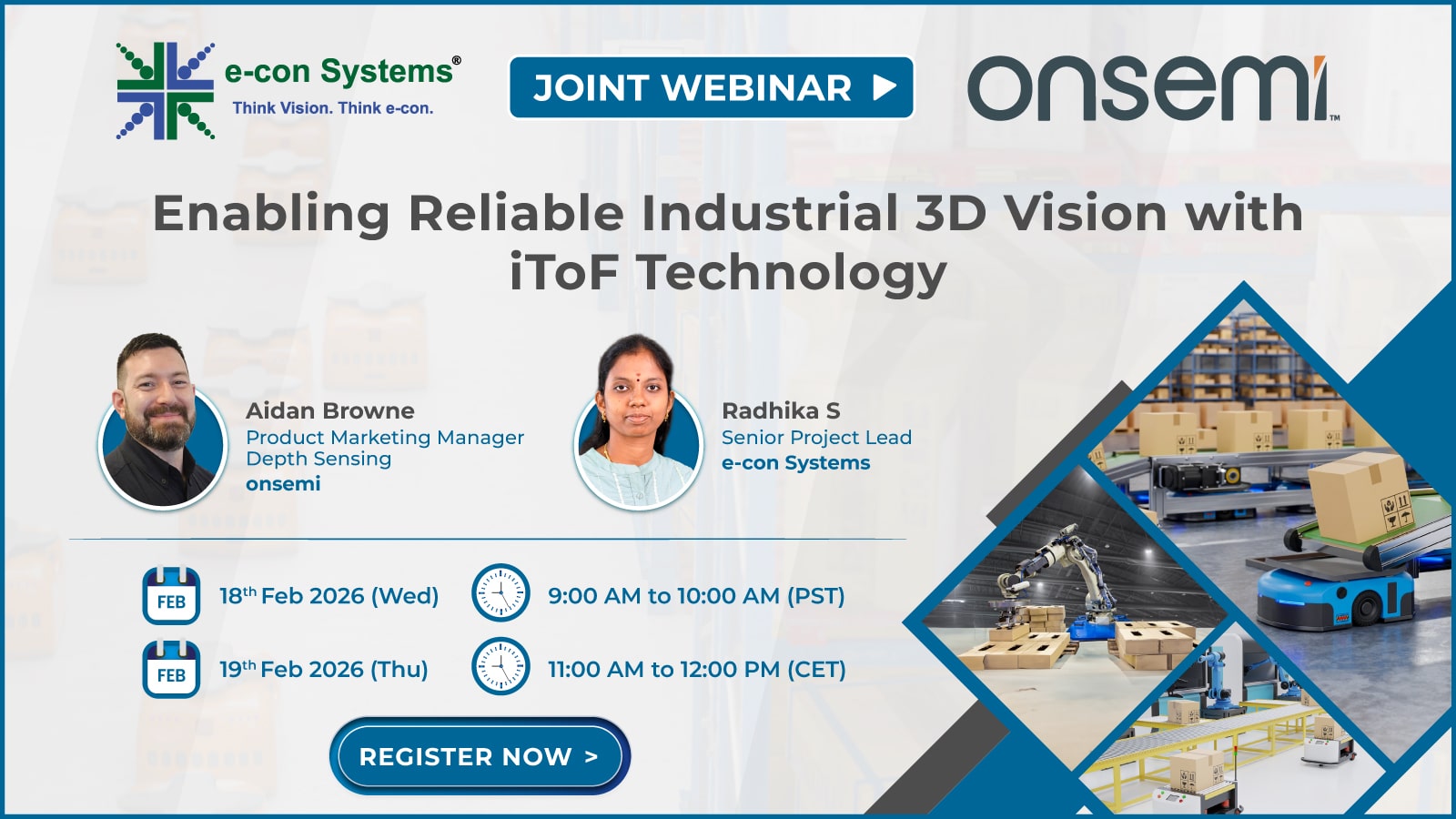 On February 18, 2026, at 9:00 am PST (12:00 pm EST), and on February 19, 2026 at 11:00 am CET, Alliance Member company e-con Systems in partnership with onsemi will deliver a webinar “Enabling Reliable Industrial 3D Vision with iToF Technology” From the event page: Join e-con Systems and onsemi for an exclusive joint webinar